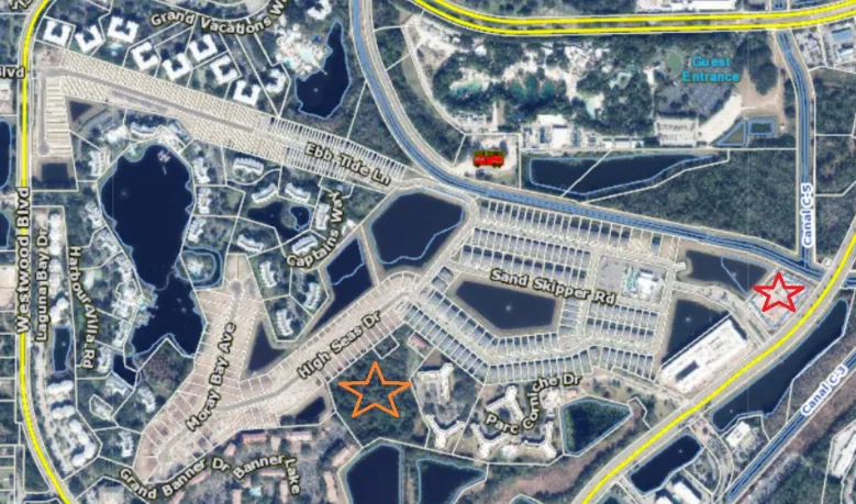 Kimaya has filed plans for new short-term vacation rentals next to Paradiso Grande along International Drive. The red star marks the proposed site, while the orange star indicates the nearby parcel approved for a 16-story timeshare tower.