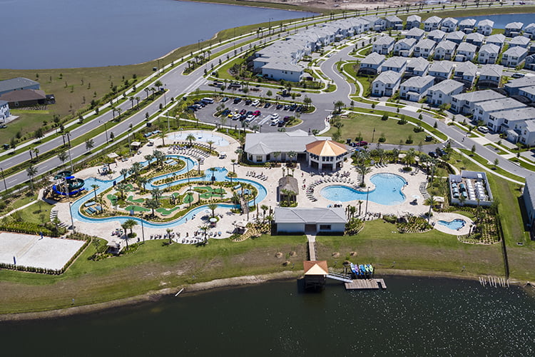 Storey Lake is known for its extensive list of resort-style amenities that appeal to residents and visitors alike. The Hideaway Club serves as the central hub for recreation and leisure, featuring a sparkling community pool, lazy river, water slides, and a splash pad for kids. Residents also enjoy a fitness center, beach volleyball courts, and kayak rentals on the lake.